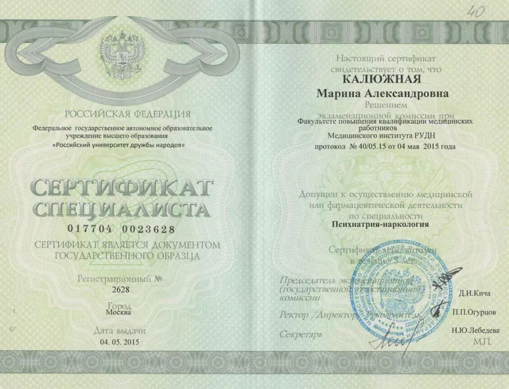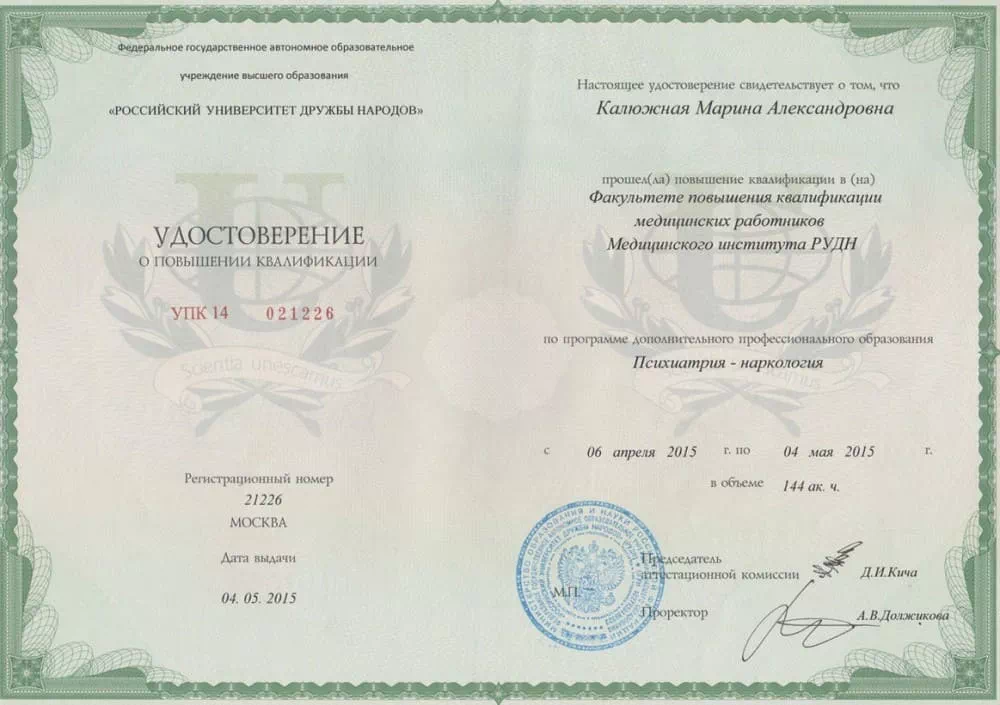 • 2015 — Российский университет дружбы народов (Повышение квалификации по программе "Психиатрия-наркология");