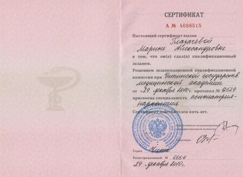 • 2010 — Читинская государственная медицинская академия (Врач по специальности "Психиатрия-наркология").